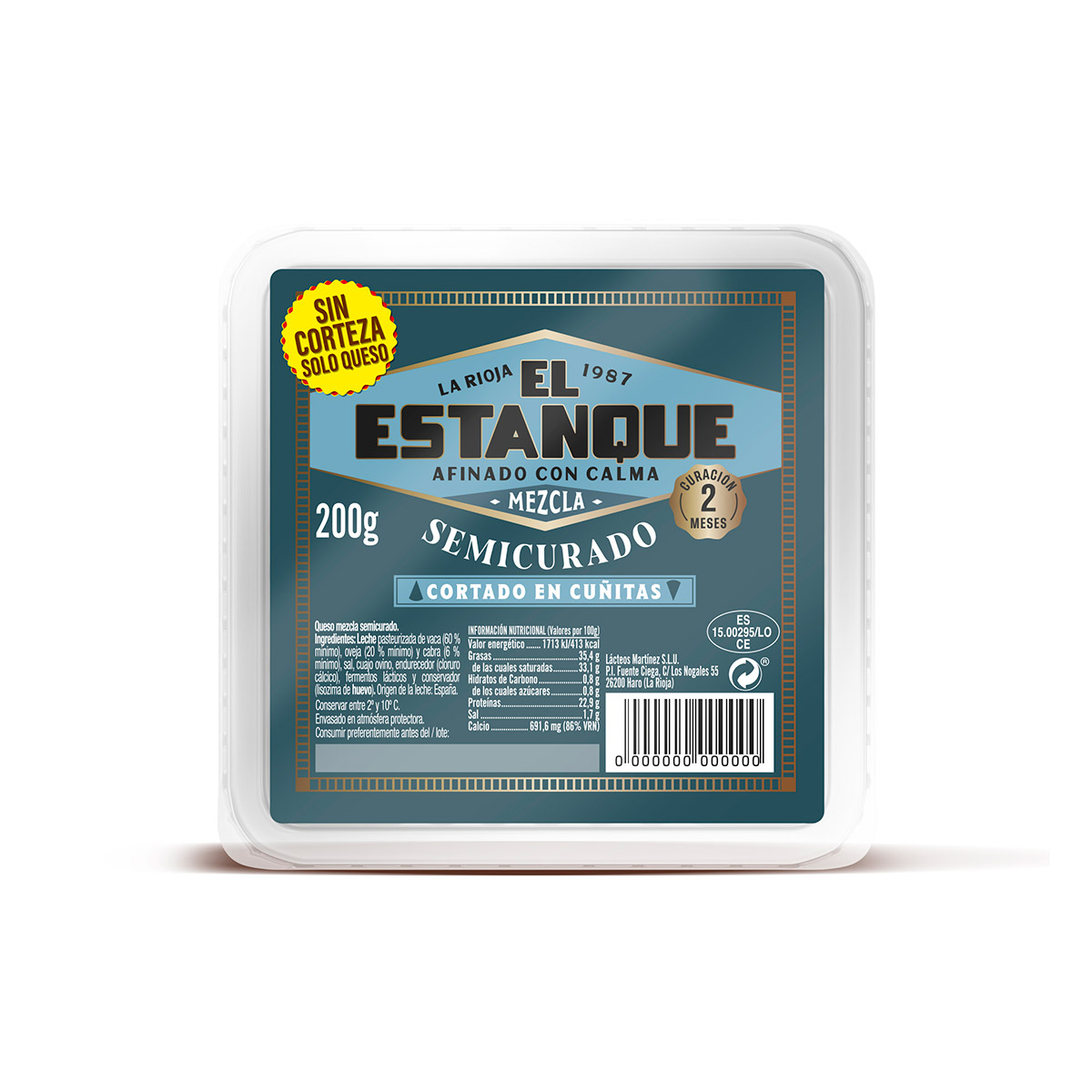 El Queso de Mezcla Semicurado El Estanque, elaborado con la mezcla de leches de vaca, oveja y cabra, utiliza cuajo ovino. Mimado por el Maestro Quesero, permanece en nuestras cavas de afinado durante 2 meses.